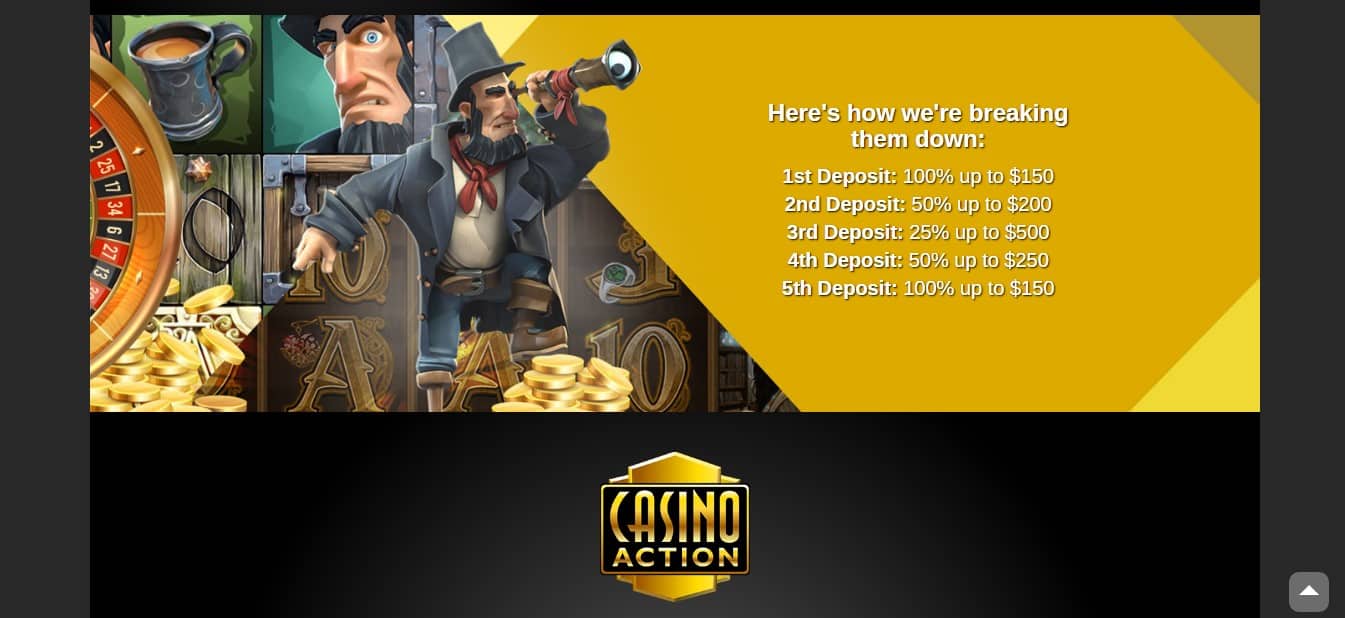 The welcome bonus is the most popular of the Casino Action rewards you’ll find here. The bonus works through your first five deposits. It does not require an Casino Action unique code for you to redeem.